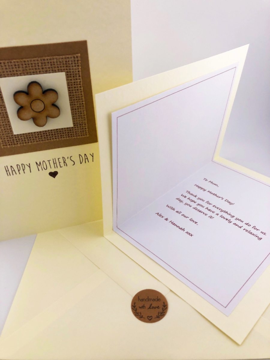 Each card is lovingly hand decorated using premium Ivory and craft brown card. It is hand stamped with ‘Happy Mother's Day’ in brown ink and finished off with a laser cut wooden embellishment of your choice (star, flower, butterfly, bee, watering can & heart).