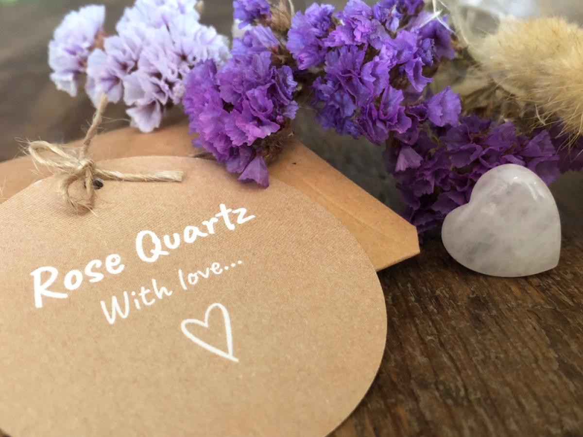 The gift is presented in a brown Kraft paper pillow box and comes complete with a gift tag symbolising the three main attributes of Rose Quartz.