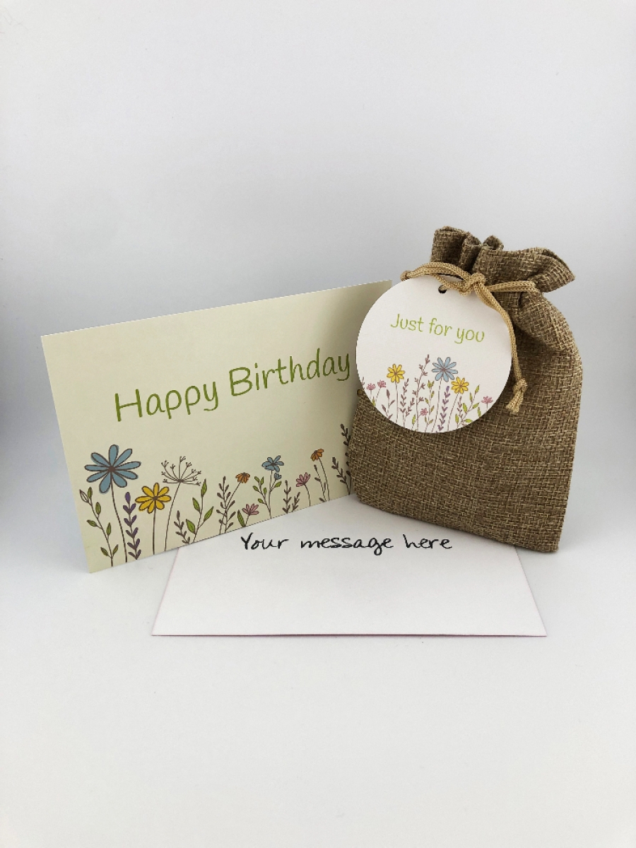 A beautiful gift bag containing native wildflower seed balls complete with message card – a thoughtful gift for anyone celebrating a birthday.