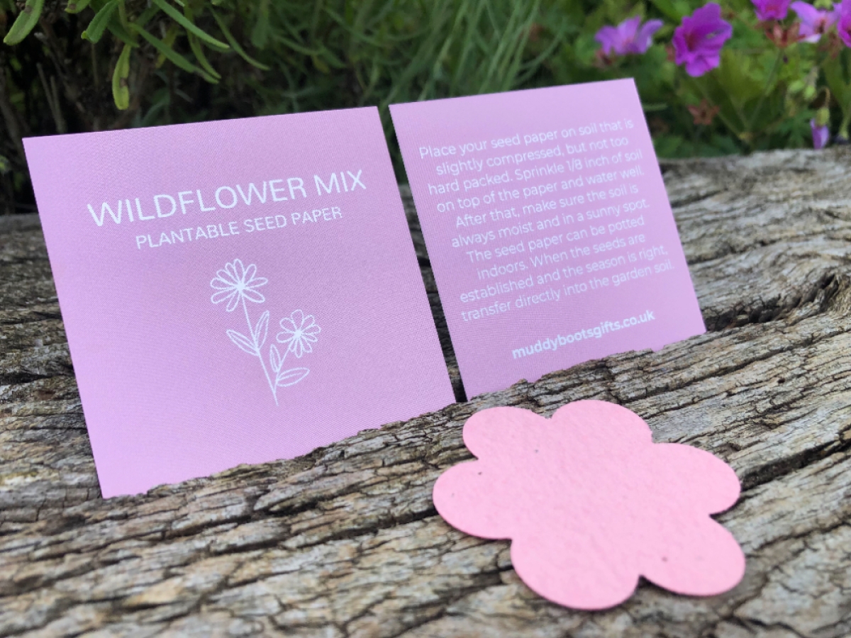 • Wildflower seed paper flower with planting instructions, presented in a glassine envelope